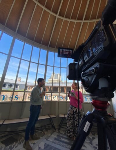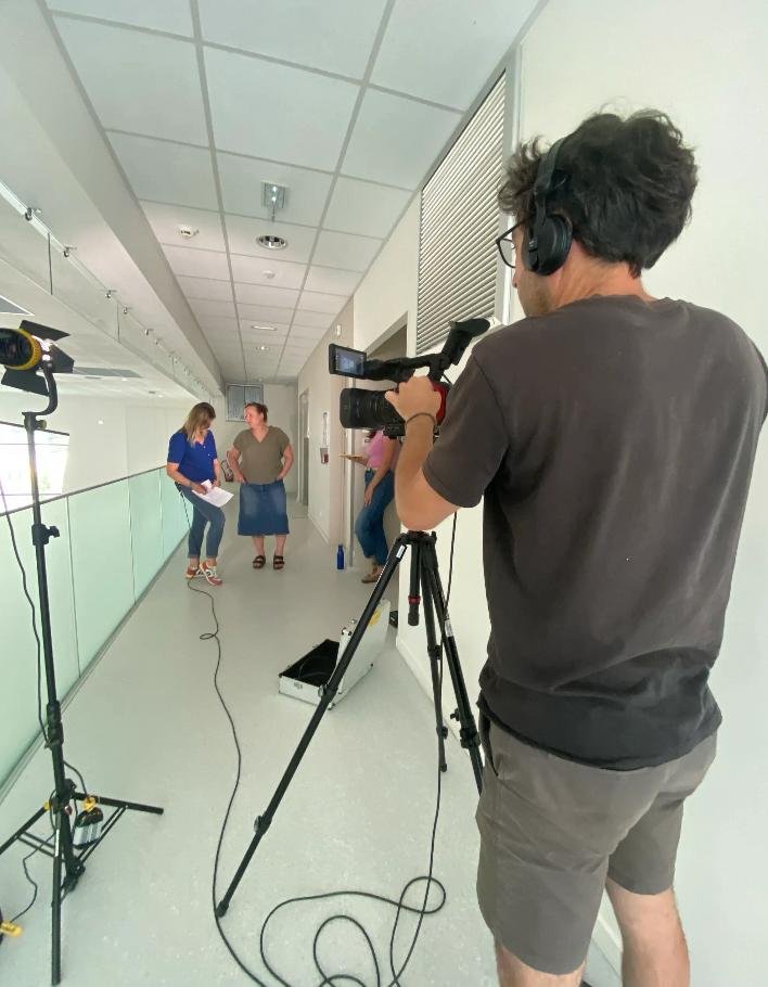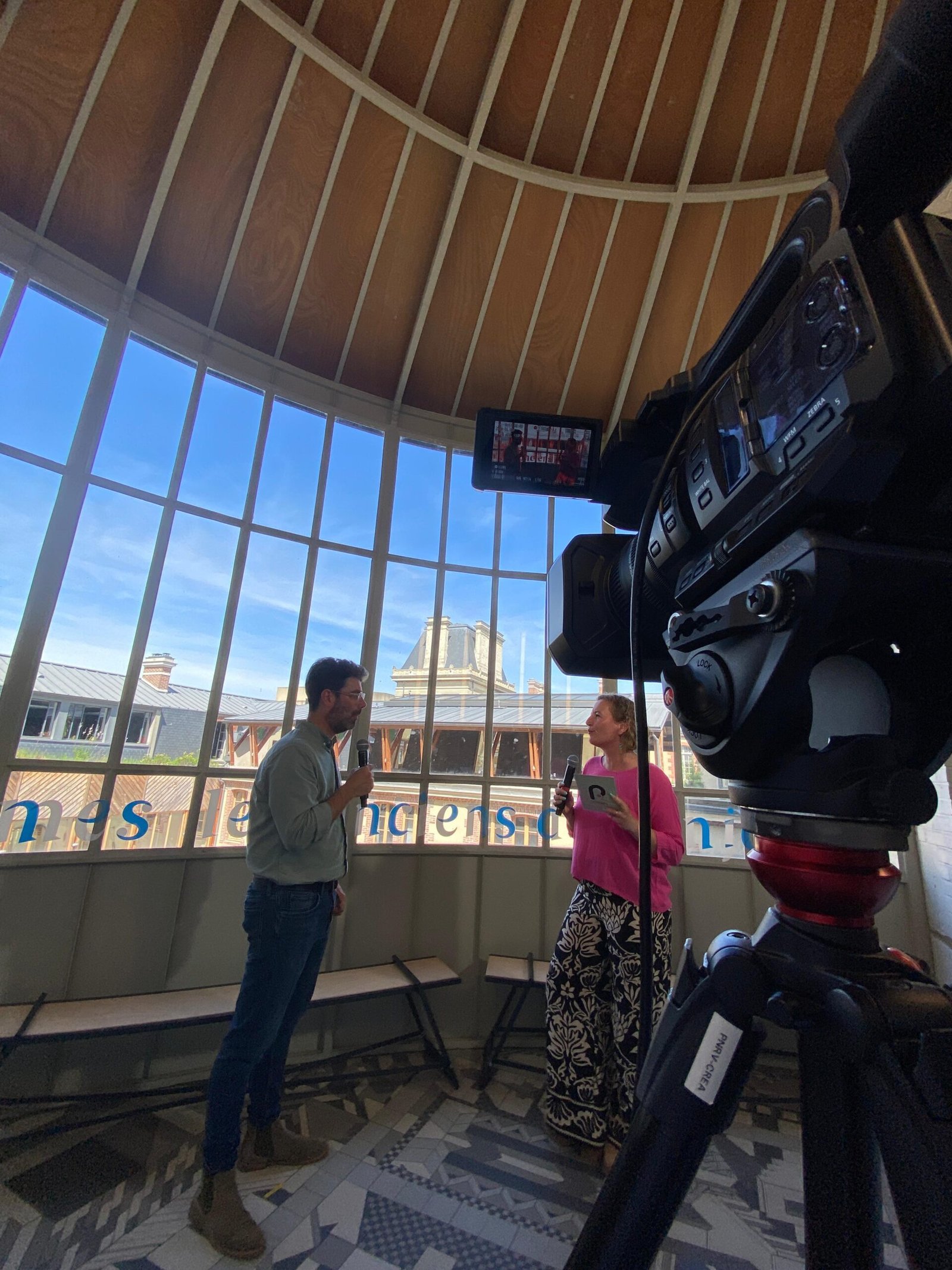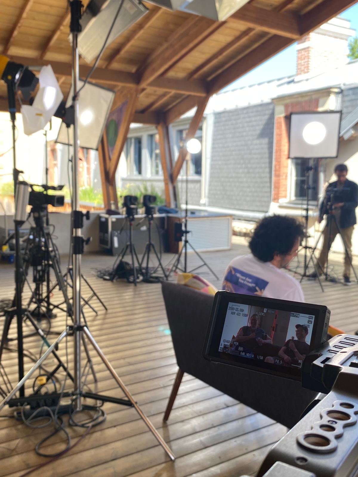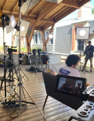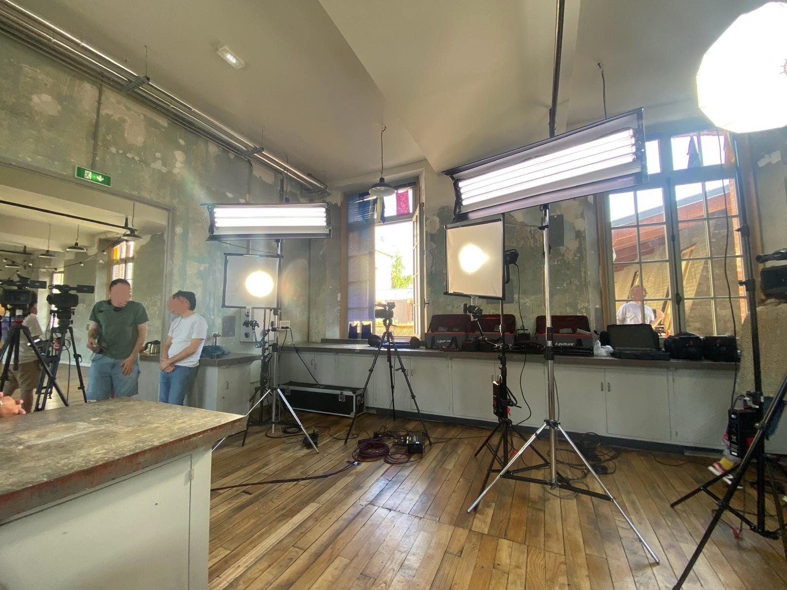 Le lendemain se tenait la grande journée de tournage des 3 plateaux avec 8 intervenants. Chaque plateau était tourné dans une pièce différente ce qui nécessitait de déplacer tout le matériel. Sur ce tournage, j’étais au cadre avec une caméra de plateau Panasonic. Sylvain, le réalisateur nous disait ce qu’il était nécessaire de filmer.